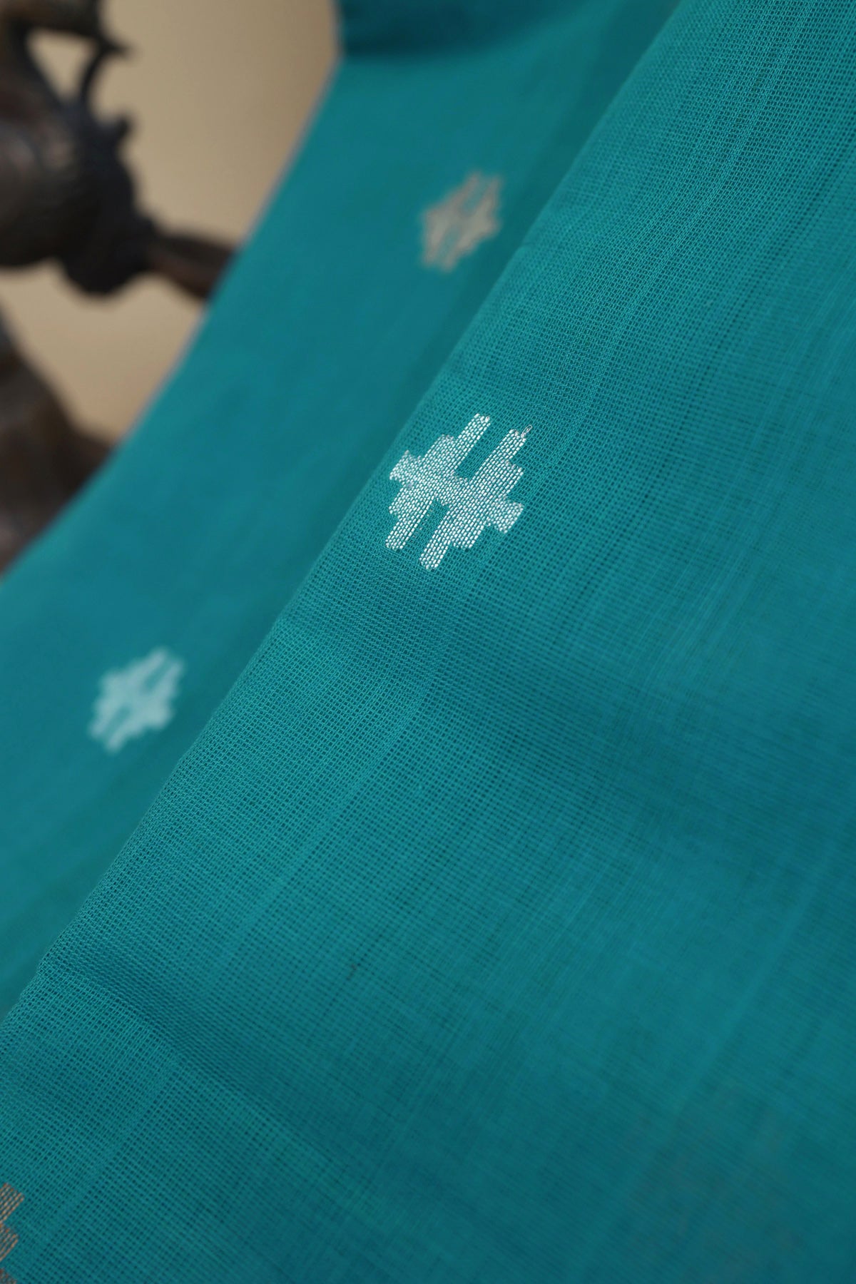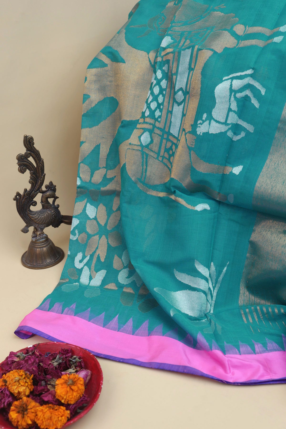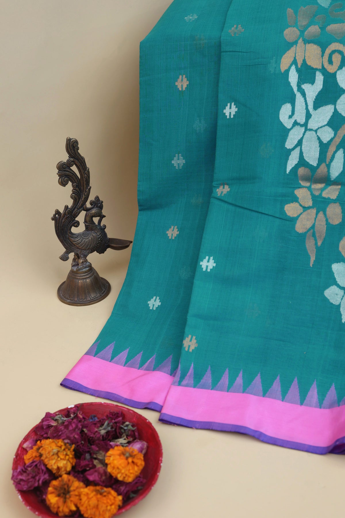 Step into timeless elegance with our Khaadi Cotton Sea Green Saree, ideal for weddings and festive celebrations. Adorned with floral buttis, it exudes heavenly charm. The contrast temple border adds traditional grandeur, while the pallu featuring florals and animals creates a celestial aura. Paired with a self with border blouse, this ensemble embodies timeless elegance for your special day.