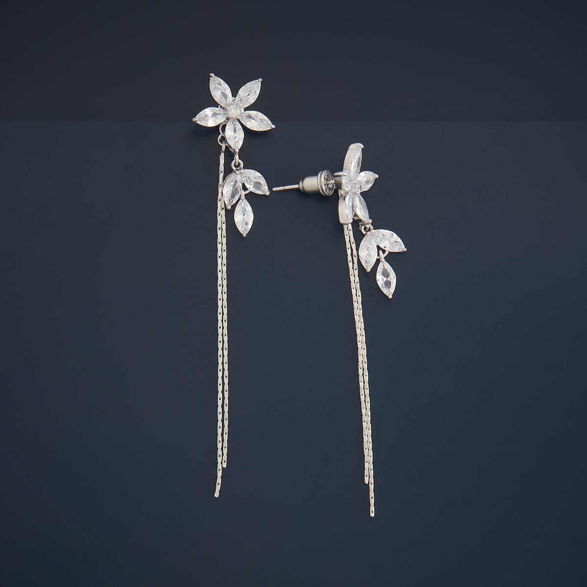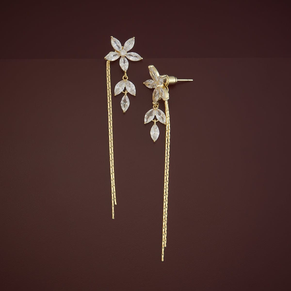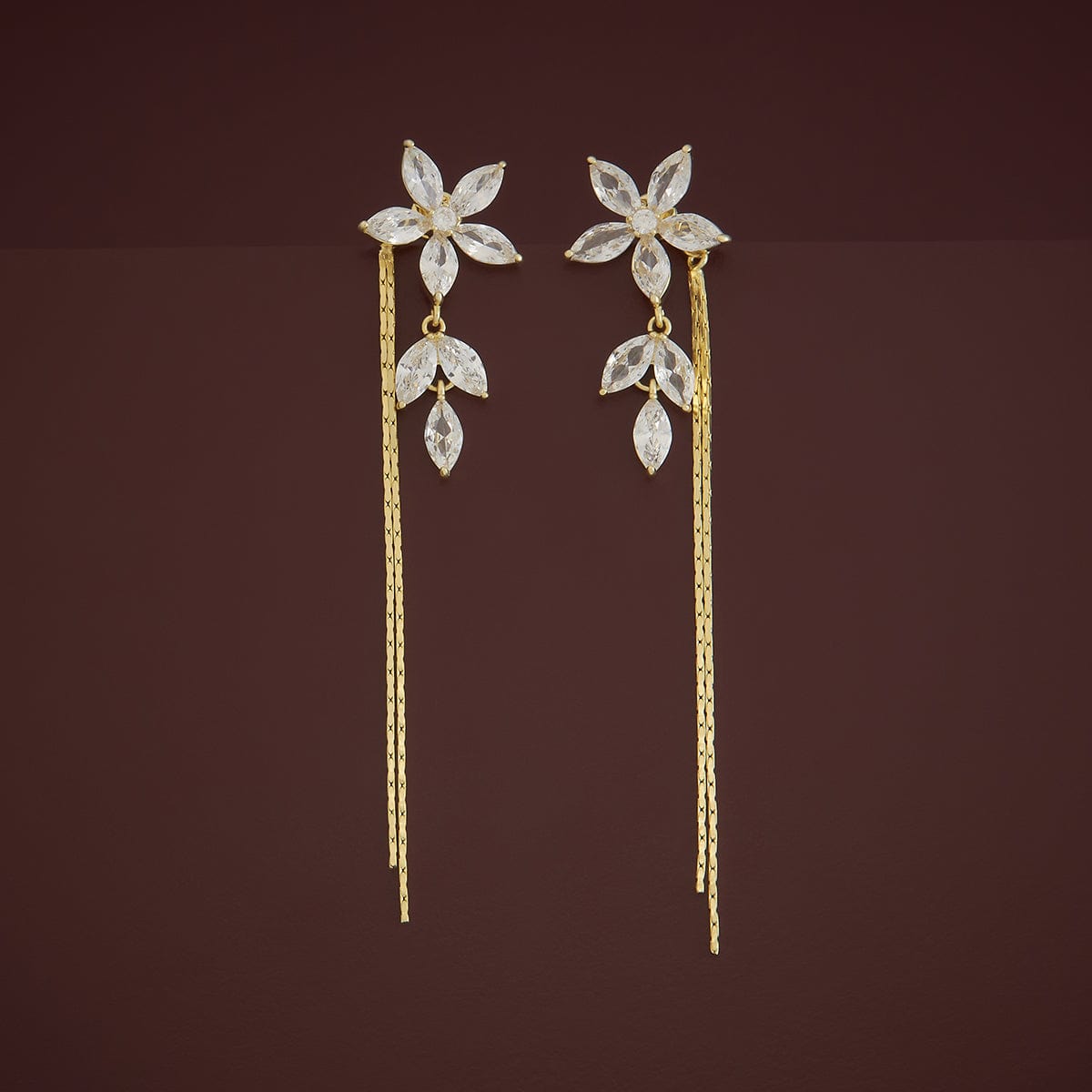 Have a look at these hanging earrings featuring a beautiful flower-shaped design with sparkling white zircon stones and a gold-polished chain. Available in gold, rose gold, or rhodium polish, they’re the perfect accessory to pair with a simple Indian suit, adding an elegant and graceful touch to your traditional look.