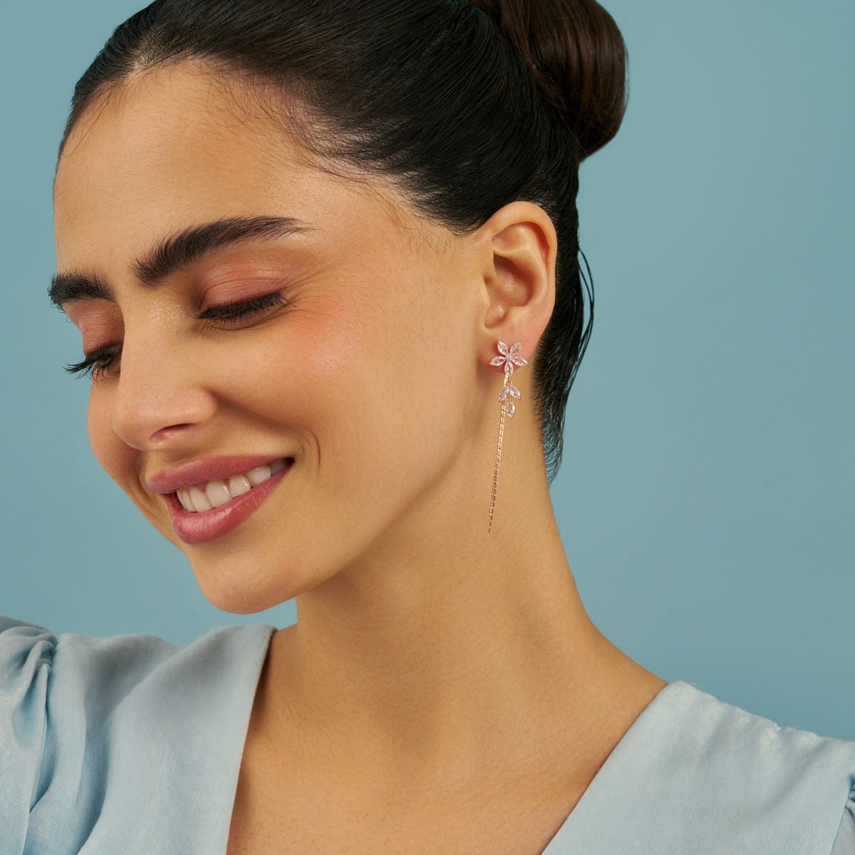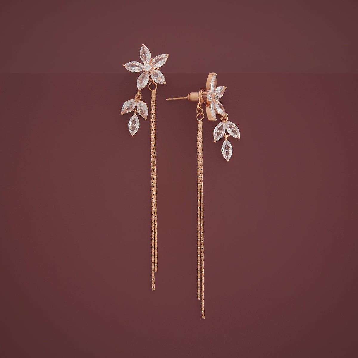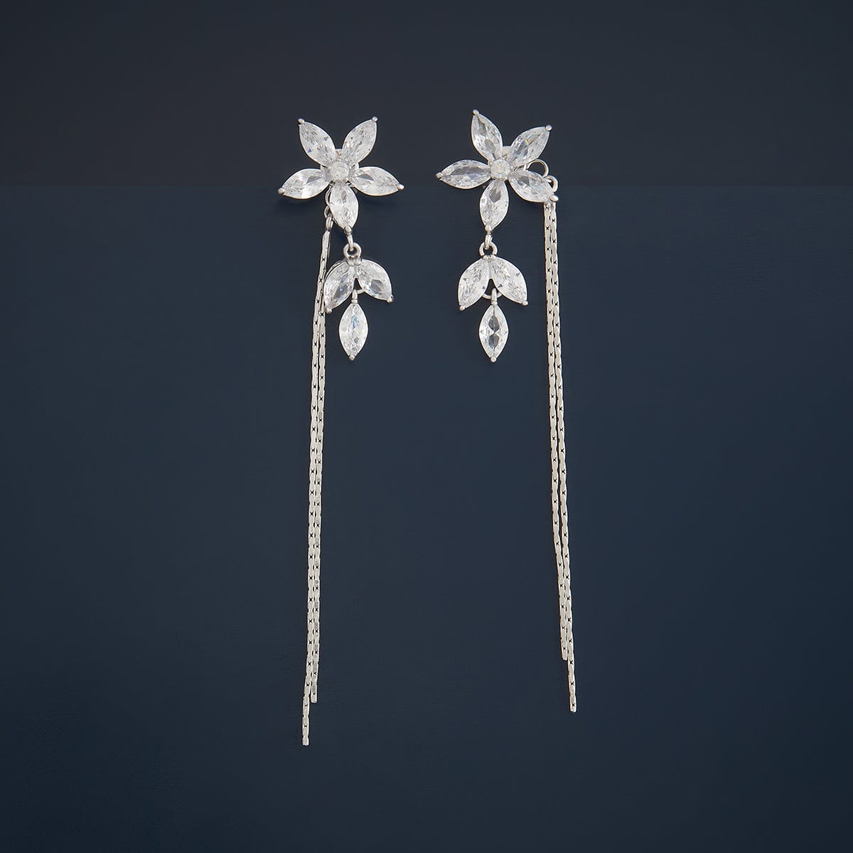 Have a look at these hanging earrings featuring a beautiful flower-shaped design with sparkling white zircon stones and a gold-polished chain. Available in gold, rose gold, or rhodium polish, they’re the perfect accessory to pair with a simple Indian suit, adding an elegant and graceful touch to your traditional look.