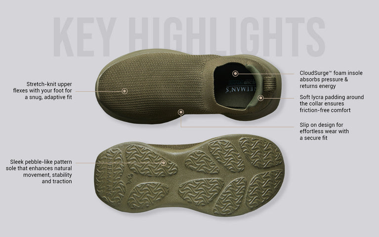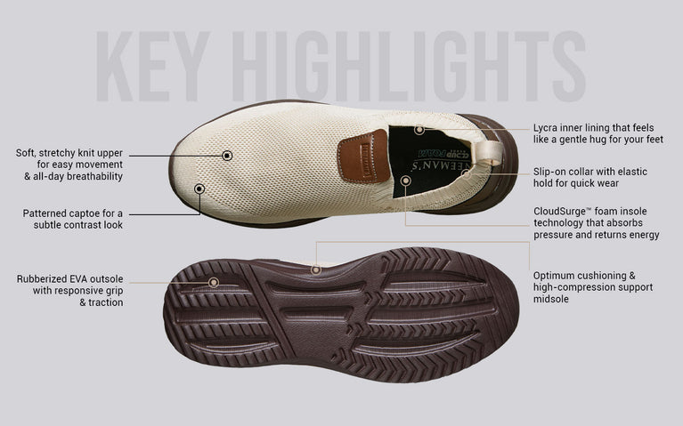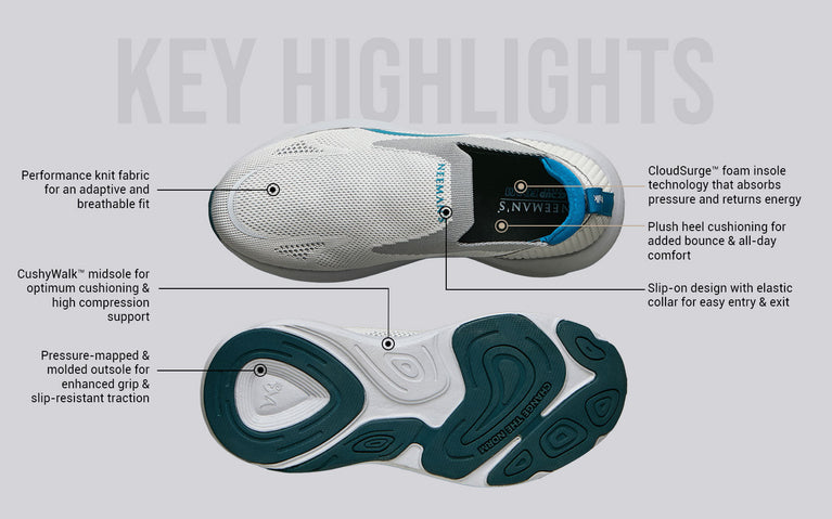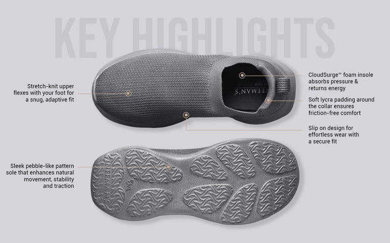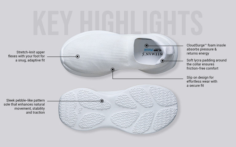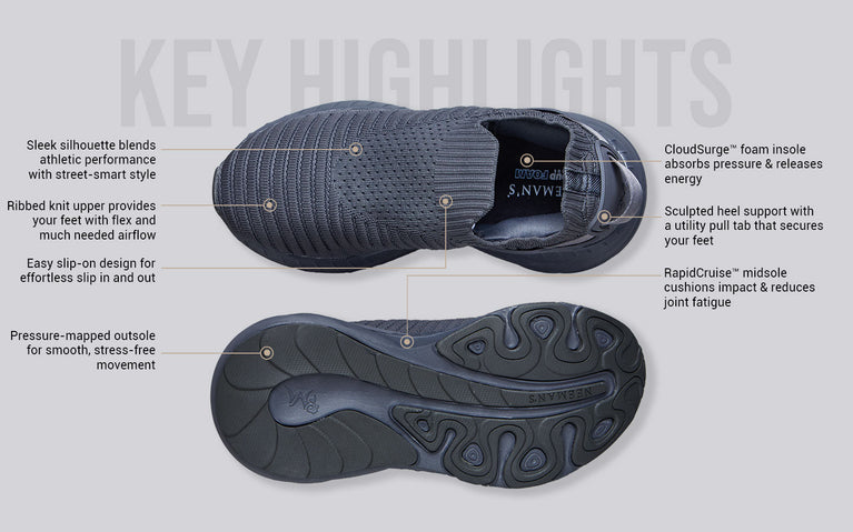 With the dual tech cushioning of our CushyWalk™ midsole and CloudSurge™ foam insole, Begin Walk Ease absorbs pressure and returns energy, adding a bounce to your steps to take on the day’s hustle. Its adaptive performance knit design hugs your feet snugly while keeping them breezy & cool and a pressure-mapped outsole reduces stress on your joints & ankles. This is minimal, with all heart.