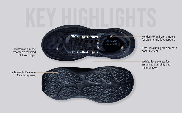 Meet The CloudKnit Sneakers—sleek, soft, and built to move. With a breathable knit upper made from recycled PET, a plush Lycra-lined interior, and a molded foam insole, every step feels light and supported. Reinforced with welded eyelets for durability and finished with Neeman’s EVA sole for flexible grip, these sneakers blend modern minimalism with all-day comfort. Designed to keep up, wherever the day takes you.