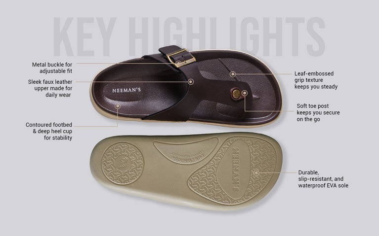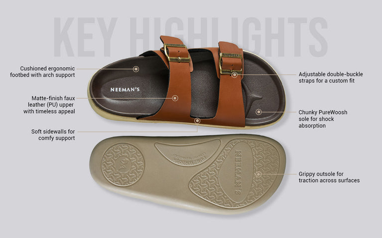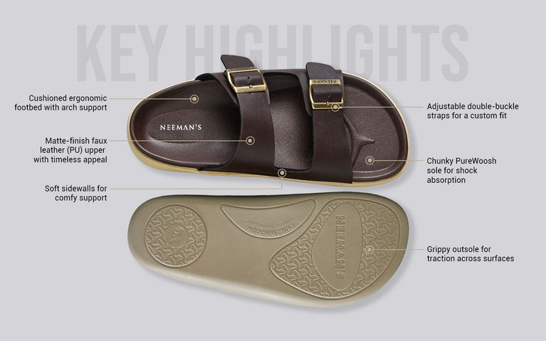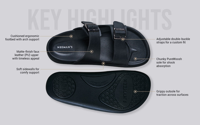 Say hello to a slide that gets it all right—style, support, and ease. PureWoosh Flow is Neeman’s spin on the timeless double-buckle silhouette, now reimagined for modern-day comfort seekers. With a sleek matte finish and soft contoured footbed, it’s built to slide into any outfit and any mood. Rain-ready, ridiculously comfy, and made to move with you, this one's a true multitasker. From weekday errands to weekend lounging, it brings just the right amount of polish to your off-duty days.