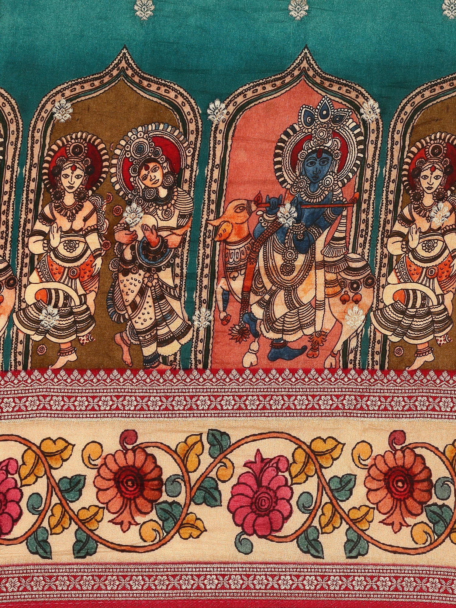 Green Banaras Silk Saree With Kalamkari Printed Border