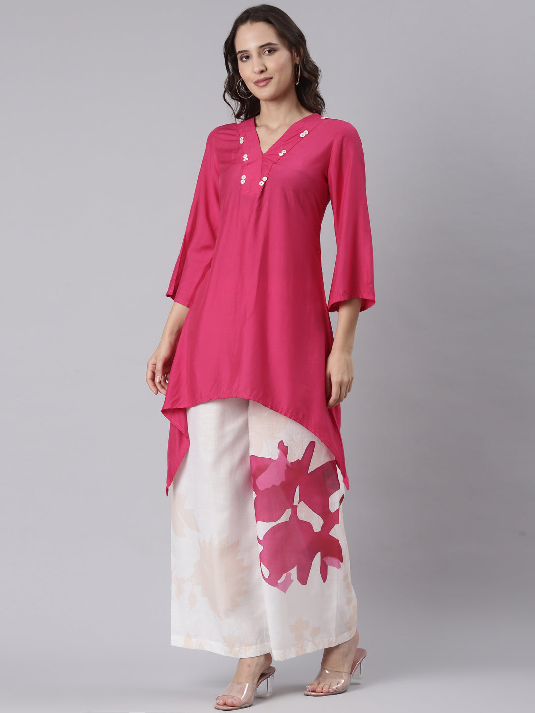 This magenta muslin two-piece set features a unique C-cut design that combines comfort with style. Crafted from breathable muslin fabric, it offers lightweight wear, perfect for all-day use. Its vibrant magenta hue adds a touch of elegance, while the two-piece setup ensures versatility in your wardrobe. Designed for expert-level comfort and easy maintenance, this set is ideal for those seeking both functionality and a refined look.