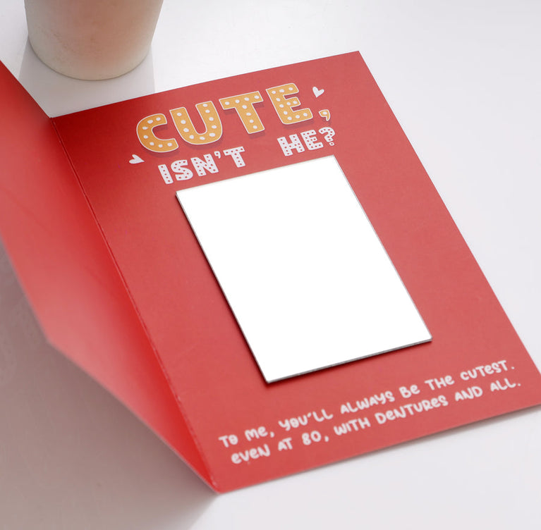 Looking for a fun, unforgettable way to propose, celebrate an engagement, or simply show your fiancé how excited you are for your future together? Greeting cards are timeless, and the Future Husband Mirror Card is a modern, witty surprise guaranteed to make him smile.The MessageThis card delivers a playful buildup to a heartfelt compliment:Front: The card boldly declares your love and commitment with the fun, engaging message: " *MEET MY FUTURE HUSBAND* "Inside: When he opens it, he’ll find his own reflection thanks to the attached mirror (positioned where the man's face is shown), along with the sweet, playful text: " *CUTE, ISN'T HE?* " This is followed by a loving commitment that is both sincere and humorously realistic: " *To me, you'll always be the cutest. Even at 80, with dentures and all* ."It’s the perfect way to playfully call him handsome and express your enduring love with a touch of humor.Specifications-Size of the Card : 25.4 x 17.8 cmsThe greeting card is elegantly wrapped in an envelope and meticulously packaged to ensure the mirror inside remains safe and intact during delivery.Note: This is a pre-packaged gift and cannot be customized.