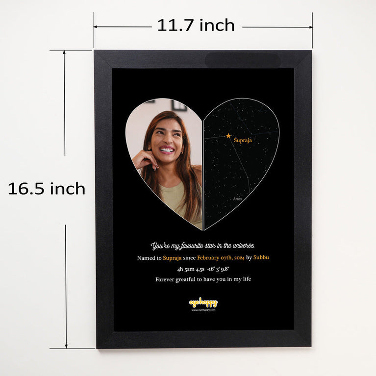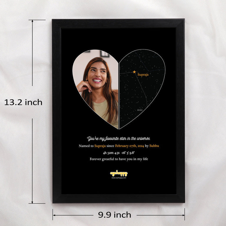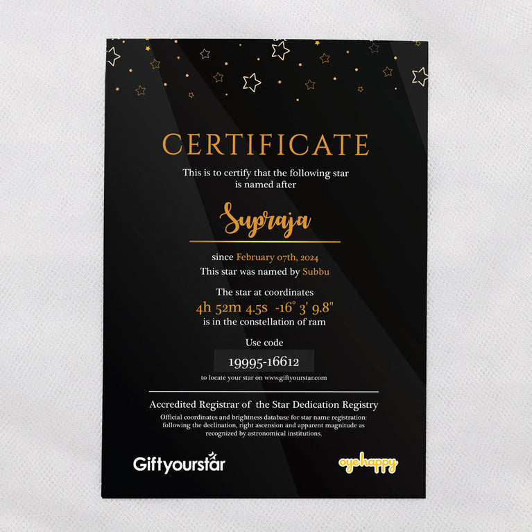 Specifications: Size of the frame: 13.2 x 9.9 inches. Oye Happy is a verified facilitator between the naming service and the customer. The company, GiftYourStar, is an Accredited Registrar of the Star Dedication Archives.The star can only be booked for the current year, not for previous years. If you input the date of the occasion as 17/03/1987, the star will automatically be booked for the current year, regardless of the entered date.