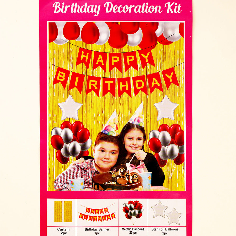 Includes - 2 golden foil curtains, “Happy Birthday” banner, Red & white metallic balloons, Star foil balloons