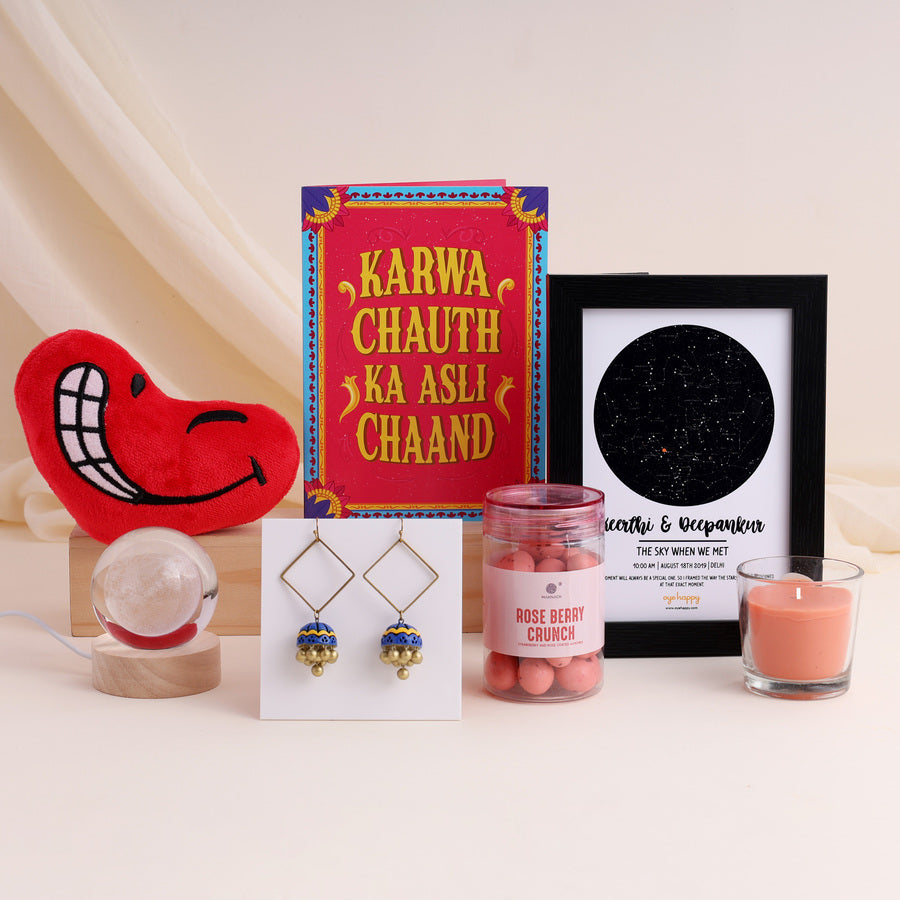 The first Karwa Chauth is always special. It’s the beginning of a lifetime of traditions, love, and promises. Therefore, her first Karwa Chauth deserves to be celebrated not just with rituals, but with 24 hours of love. Here's a hamper to make sure that your wife feels cherished, adored, and truly special from the moment she wakes up till midnight. This surprise comes with 7 of our romantic gifts neatly gift-wrapped into one hamper box. Each gift has instructions on when to open the box.