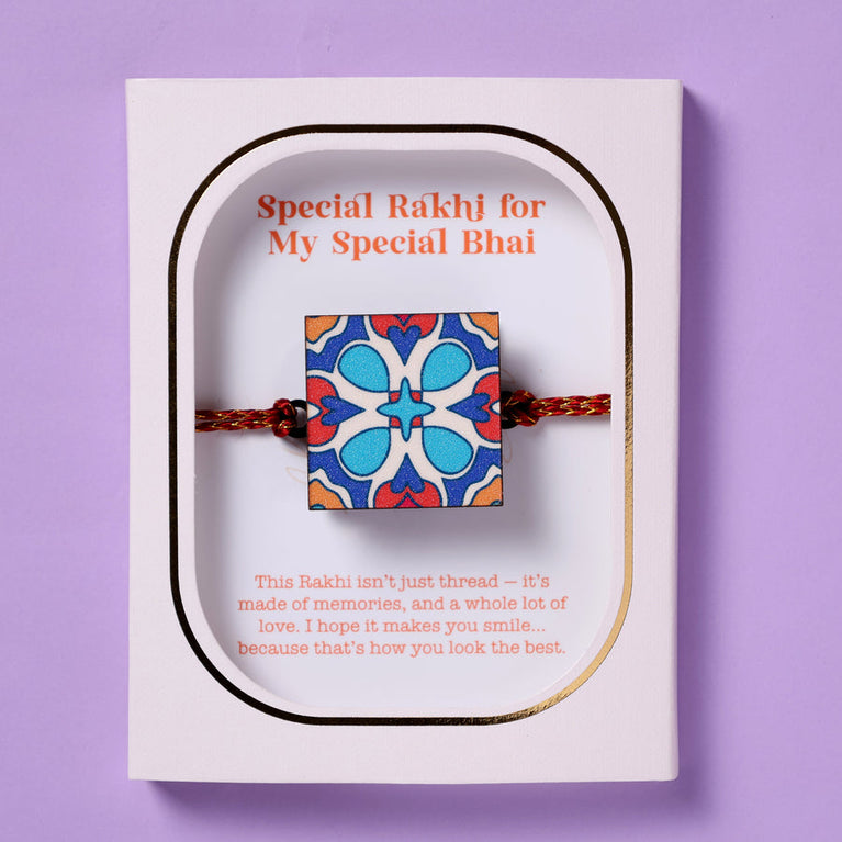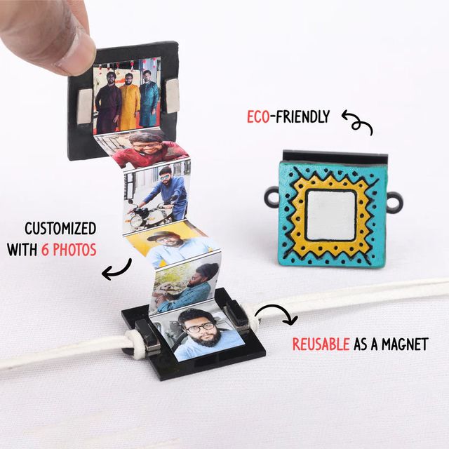 Meet our bestselling ‘Secret Photo Rakhi’ – crafted from eco-friendly terracotta, customized with 6 personalized photos, and designed to be reused as a fridge magnet.This unique rakhi is shaped like a tiny square box that secretly holds cherished photographs. Simply open the rakhi to reveal the magical memories inside.For an extra touch, you can also add your brother’s initials to the rakhi. Specifications: