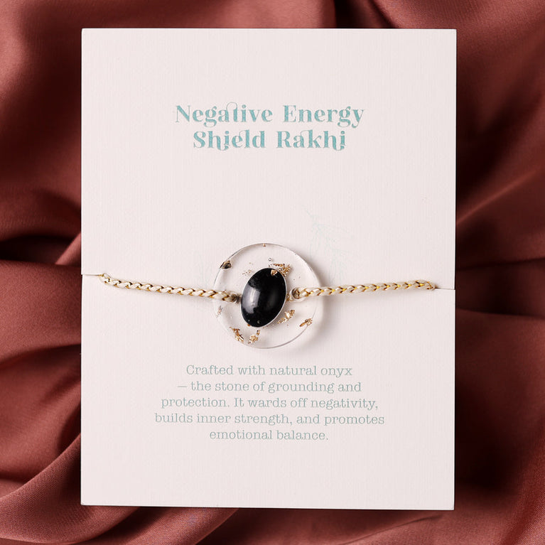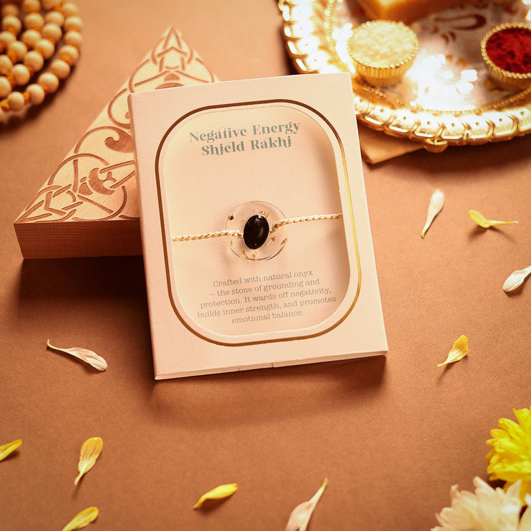 This Nazar Kawach Rakhi is crafted with natural onyx—the stone of grounding and protection. Known for warding off negativity, building inner strength, and promoting emotional balance, this rakhi carries powerful protective energy.The onyx stone is authentic and certified by the Gemological Institute (certificate not included with the Rakhi).Tie this rakhi to your brother and shield him with the strength and protection of onyx this Raksha Bandhan.Size: 2.5 x 2.5 cm