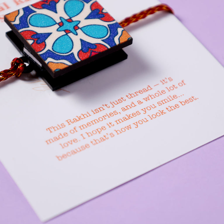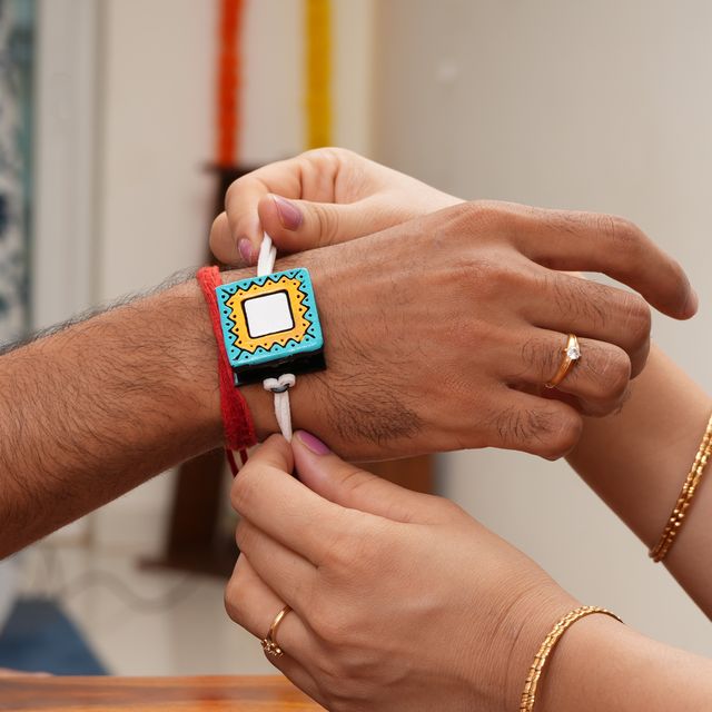 In case you don’t have 6 photos, share what you have and we will write Happy Raksha Bandhan in the remaining slots.Similarly, it is not mandatory to share your brother’s initials in the order form. The Rakhi looks just as amazing without it.Approximate size of the Rakhi: 3.1 x 3.1 cmThe base of the Rakhi is magnetic. You simply have to remove the thread and stick this on the fridge after Raksha Bandhan is overThe gift box includes a bottle of roli and chawal