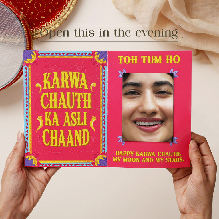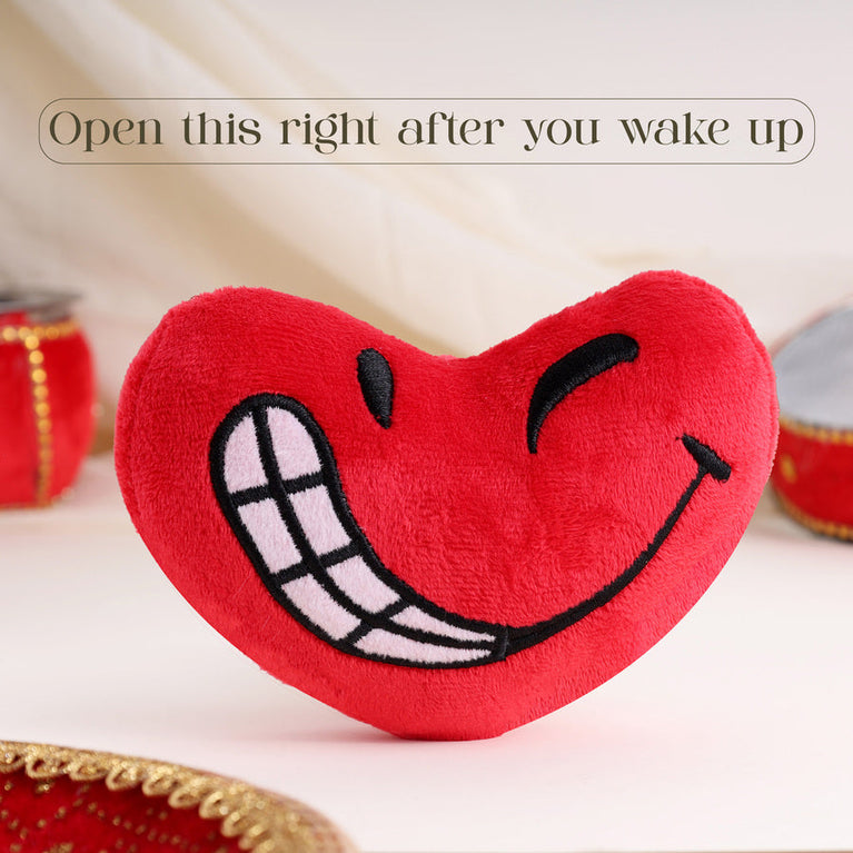 The first Karwa Chauth is always special. It’s the beginning of a lifetime of traditions, love, and promises. Therefore, her first Karwa Chauth deserves to be celebrated not just with rituals, but with 24 hours of love. Here's a hamper to make sure that your wife feels cherished, adored, and truly special from the moment she wakes up till midnight. This surprise comes with 7 of our romantic gifts neatly gift-wrapped into one hamper box. Each gift has instructions on when to open the box. Open this right after you wake up -Ted Talks - Start her very first Karwa Chauth morning with your voice wrapped in a cuddle. A soft, heartwarming surprise to remind her she’s never alone in this journey of love. The sweetest way to say “Good morning, my love” on her very first fast for you. It is the cutest way to tell your wife how much you love her. This insanely fluffy heart comes with an audio device hidden inside. All you have to do is share a voice message with us and we’ll upload it on the device so that every time it is pressed, your voice will play from the stuffed toy. And you know what’s cooler? This device is re-recordable. That means you can choose to record a new message every morning for your partner to make them smile with. Open this at night - Moon Lamp - A little moon for her before the real one rises - just for her first Karwa Chauth night. To light up the moment when she waits for the moon with love in her eyes.Open at noon - Peach Scented Candle - A fresh peachy fragrance to keep her relaxed and glowing through the day. Perfect for her first Karwa Chauth afternoon.Open this after lunch - Rose Almond Chocolate - A sweet little surprise waiting for her after the fast. Rosy, nutty, and filled with loveOpen this in the evening - Jhumka - A pair of pretty jhumkas to complete her Karwa Chauth look.Open this right before bed - Mirror Card - Greetings Cards never go out of fashion in matters of love. Here’s a surprise mirror card for your wife which is guaranteed to make her blush. This card tells them that they are your forever chaand.Open at midnight -The Star Above Us - A piece of the sky, capturing the moment your forever began. The perfect ending to her first Karwa Chauth - a star that marks your love story. If there’s a special moment that you’d like to frame, like the moment of your wedding or the time you first met your wife - this is best way to make it special.