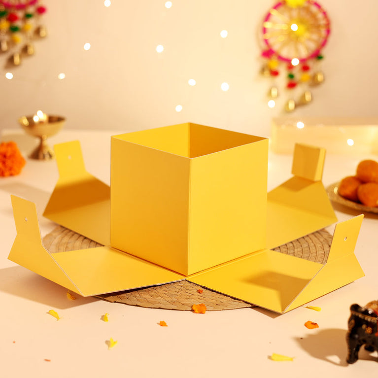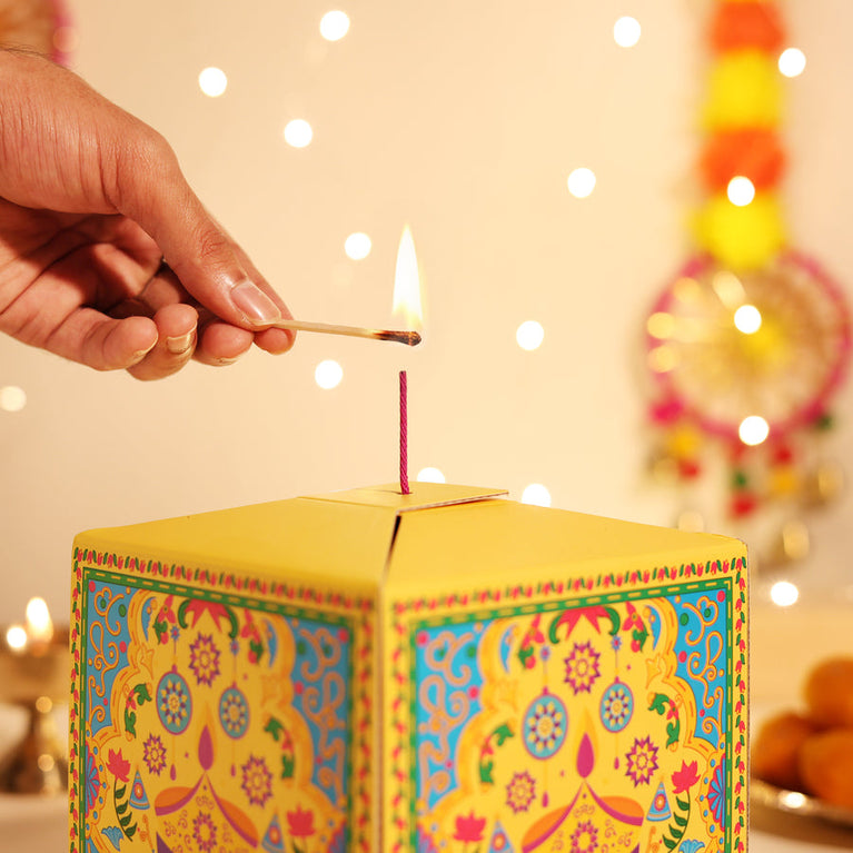 Introducing India’s First Patakha Box — a one-of-a-kind festive surprise that looks like a cracker but opens up as a magical hamper. It’s designed to give you the joy of lighting something special without any noise, or pollution.Celebrate Diwali with a thoughtfully curated hamper that includes:Paan candyLaddoo CandlesIncense ConesA beautiful Greeting CardDesigner Colorful DiyaHow It Works :The Patakha Box is simple and safe to use:Light the wick or pull it gently.Watch the box unfold in a magical way.Experience the joy of festive unboxing with none of the mess or worry.Specifications -Size of the box: 14 cm X 14 cm X 14 cm