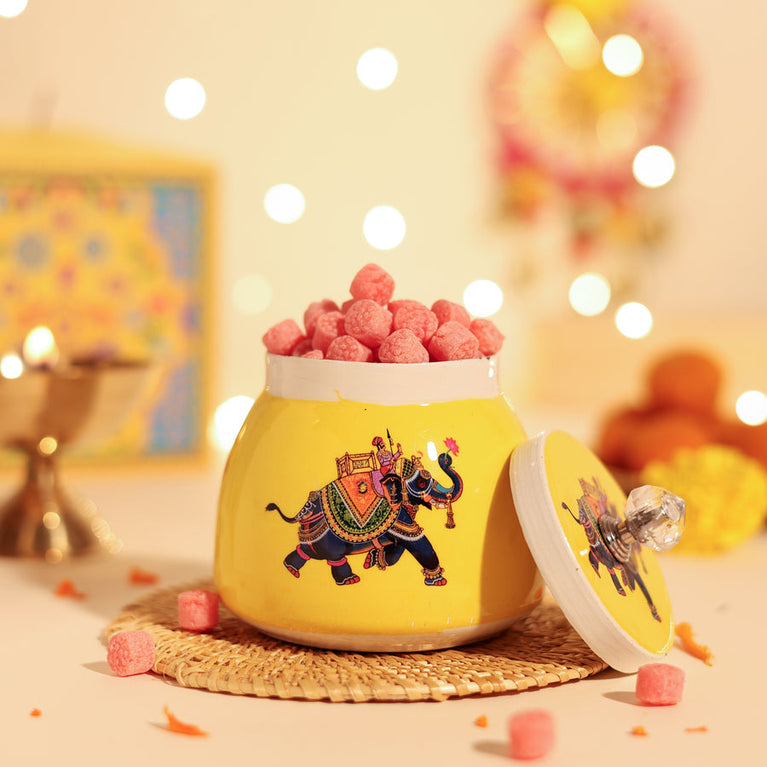 Introducing India’s First Patakha Box — a one-of-a-kind festive surprise that looks like a cracker but opens up as a magical hamper. It’s designed to give you the joy of lighting something special without any noise, or pollution.Celebrate Ghar Waali Diwali with a thoughtfully curated hamper that includes:Peri Peri CashewsPepper Almond CrunchLaddoo CandlesIncense ConesA beautiful Greeting CardDesigner Colorful DiyaHow It Works :The Patakha Box is simple and safe to use:Light the wick or pull it gently.Watch the box unfold in a magical way.Experience the joy of festive unboxing with none of the mess or worry.Specifications-Size of the box: 14 cm X 14 cm X 14 cm