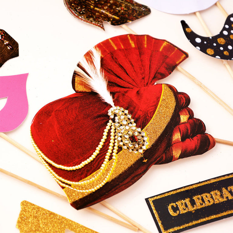 Add fun and flair to wedding celebrations with this complete party props kit! Perfect for Mehendi, Sangeet, and Reception events, it combines traditional and modern elements to create Insta-worthy memories. Pre-mounted props make photo sessions quick and entertaining, adding sparkle and style to every click.Specifications:Includes - "Bride" & "Groom" glasses, glittery turbans, diamond rings, "Just Married" signs, bridal dupatta, sehra props, and other stylish cutouts
