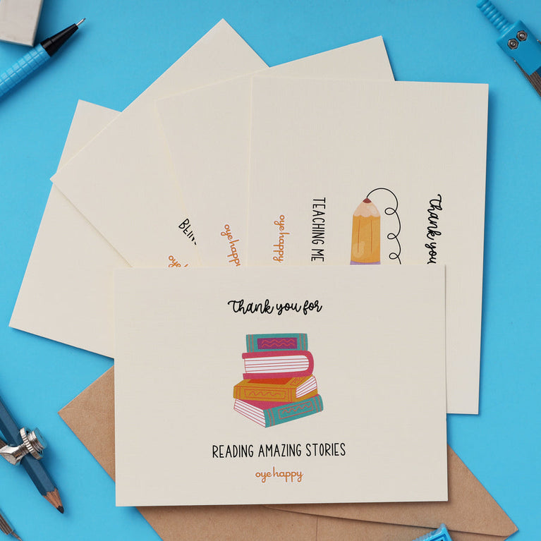 A teacher's day gift that is cute, colorful, and packed with kindness! This set of 5 adorable thank you cards is perfect for students or anyone looking to thank a teacher in the most adorable way. It's thoughtful, fun, and sure to make them feel extra special.Specifications: Size of each Card - 9.8 x 14 cmsNumber of Cards- 5 Cards