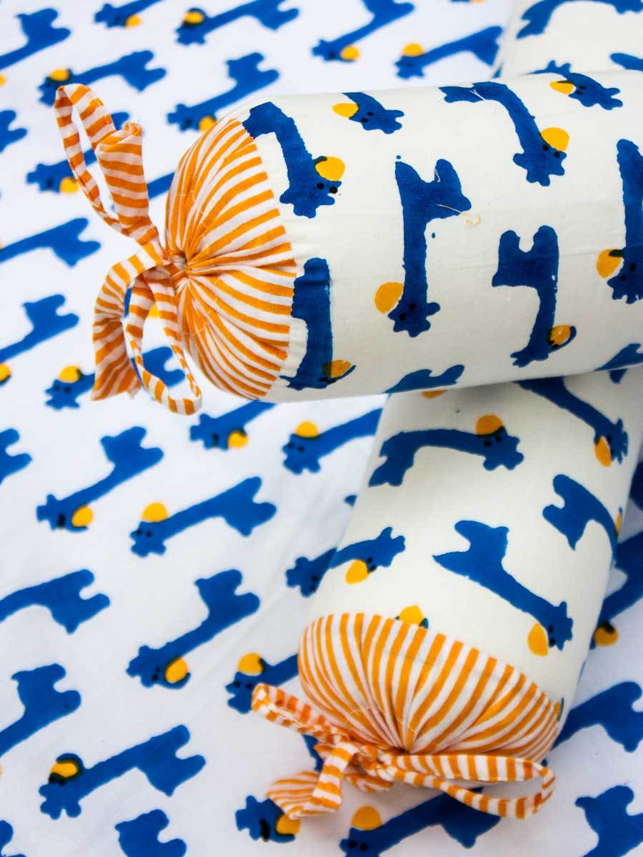 Dress up your baby's crib/cot with our lovely hand block print bolsters made with 100% GOTS certified organic cotton. The bolster cover can be easily removed for washing. This set contains two bolster pieces.