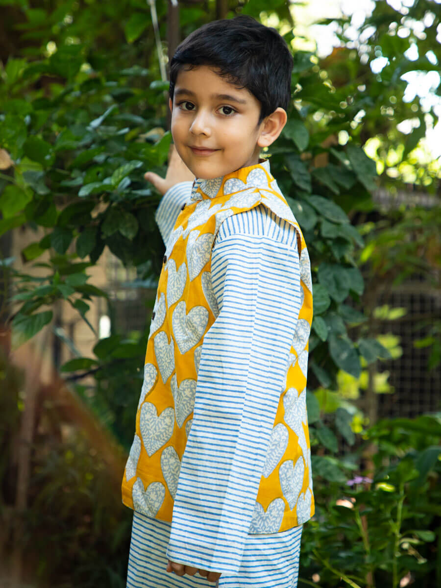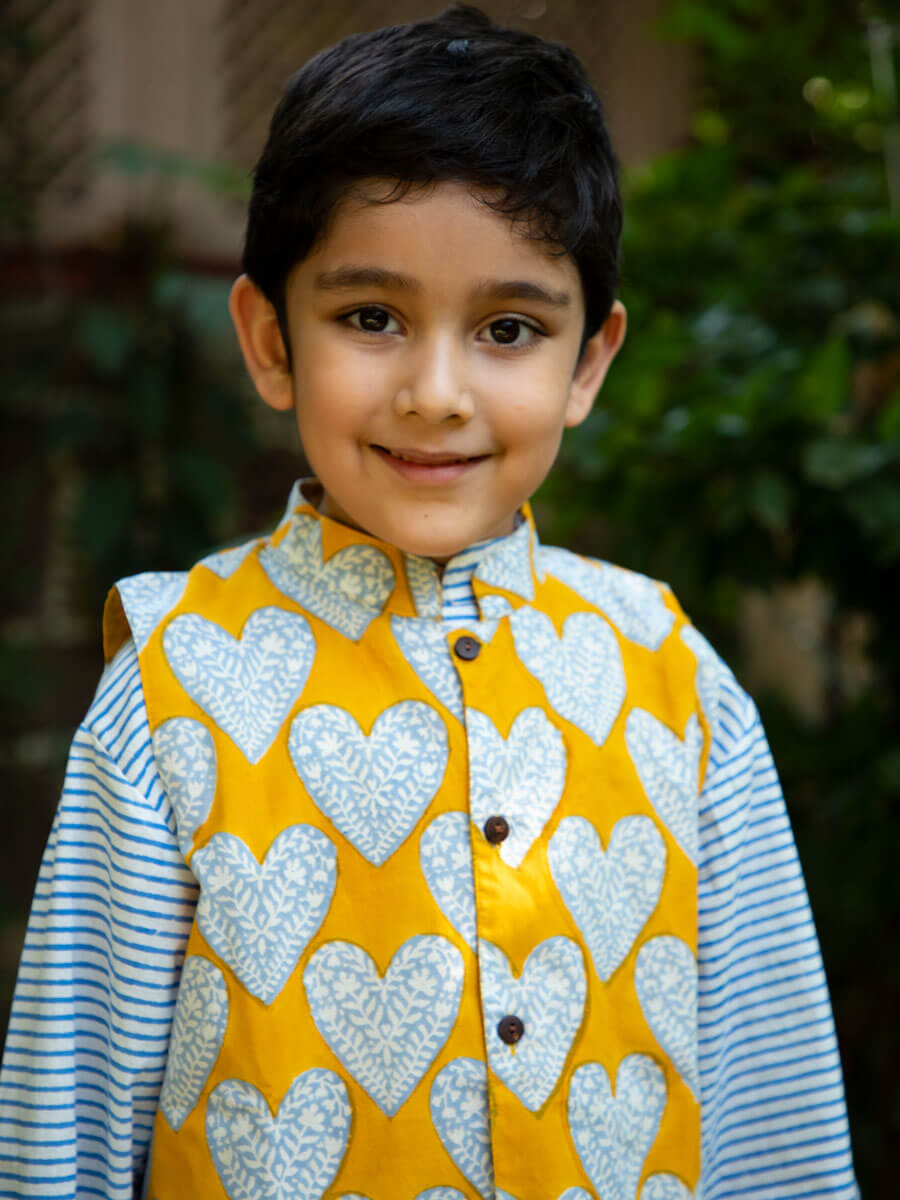 Presenting festive kurta and jacket sets for our little customers. Keeping true to our style and quality commitment, each piece is handcrafted in high-quality embellished cotton and certified organic cotton. Hand block printed with festive butis, embellished with intricate buttons and designed to be super comfortable; our festive collection makes kids sparkle!