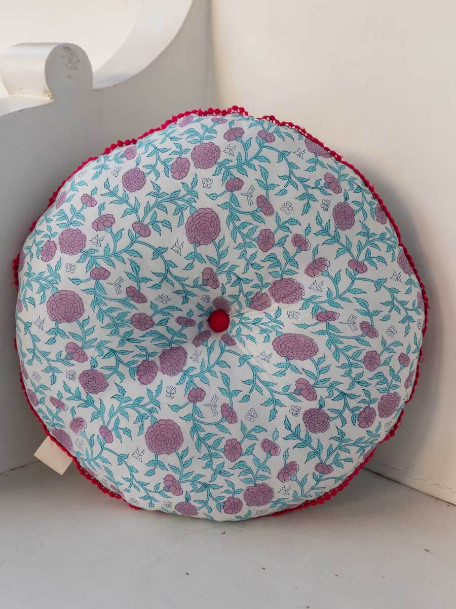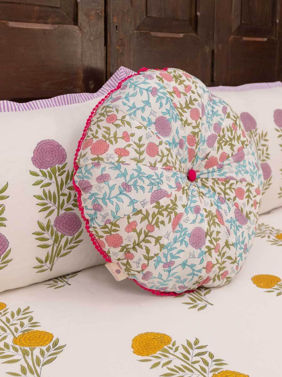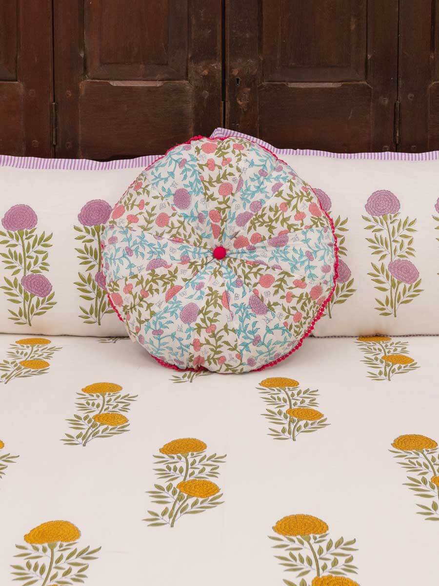 Spring Time Block Printed Cotton Pinwheel Cushion With Filler - 16 Inch
