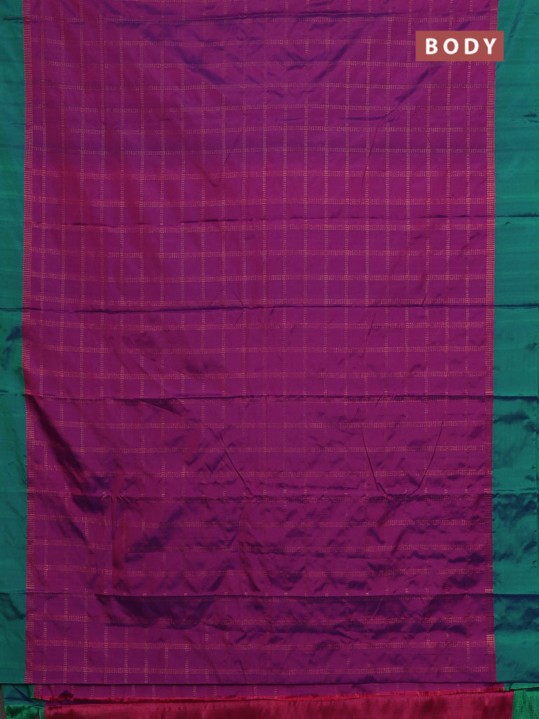 Arani semi silk saree purple and green with allover copper zari checked pattern and copper zari woven simple border