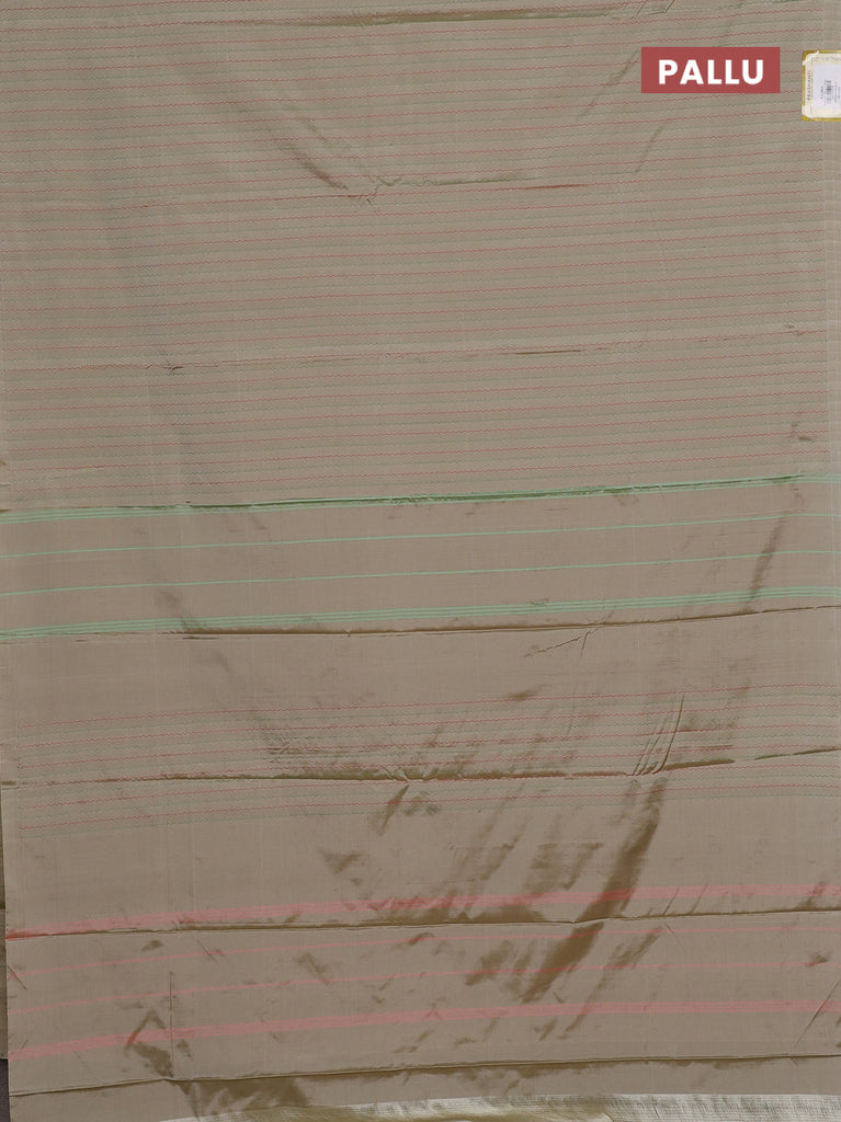 Arani semi silk saree green and dual shade of pink with allover copper zari checked pattern and copper zari woven simple border