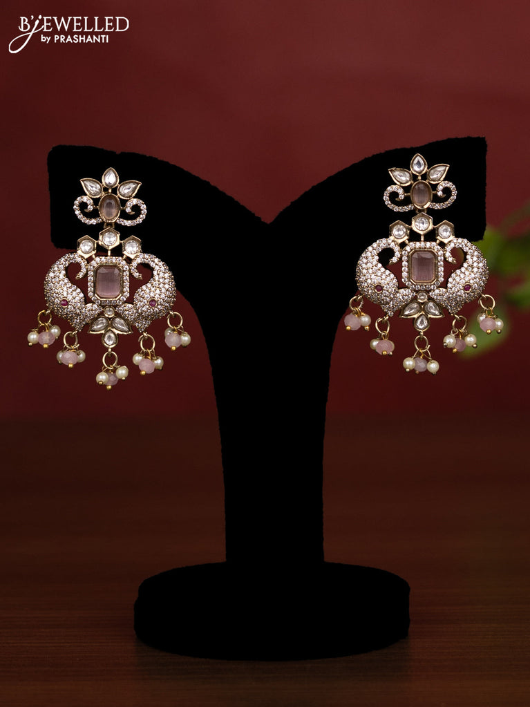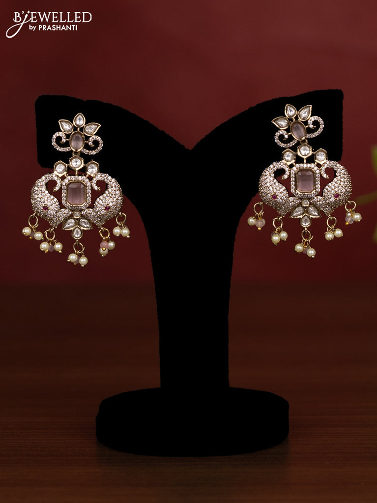 Beaded triple layer violet necklace peacock design with kundan & cz stones and pearl & beads hanging