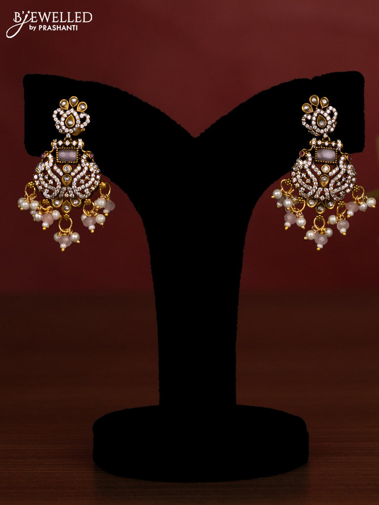 Beaded triple layer baby pink necklace with kundan & cz stones and pearl & beads hanging in victorian finish