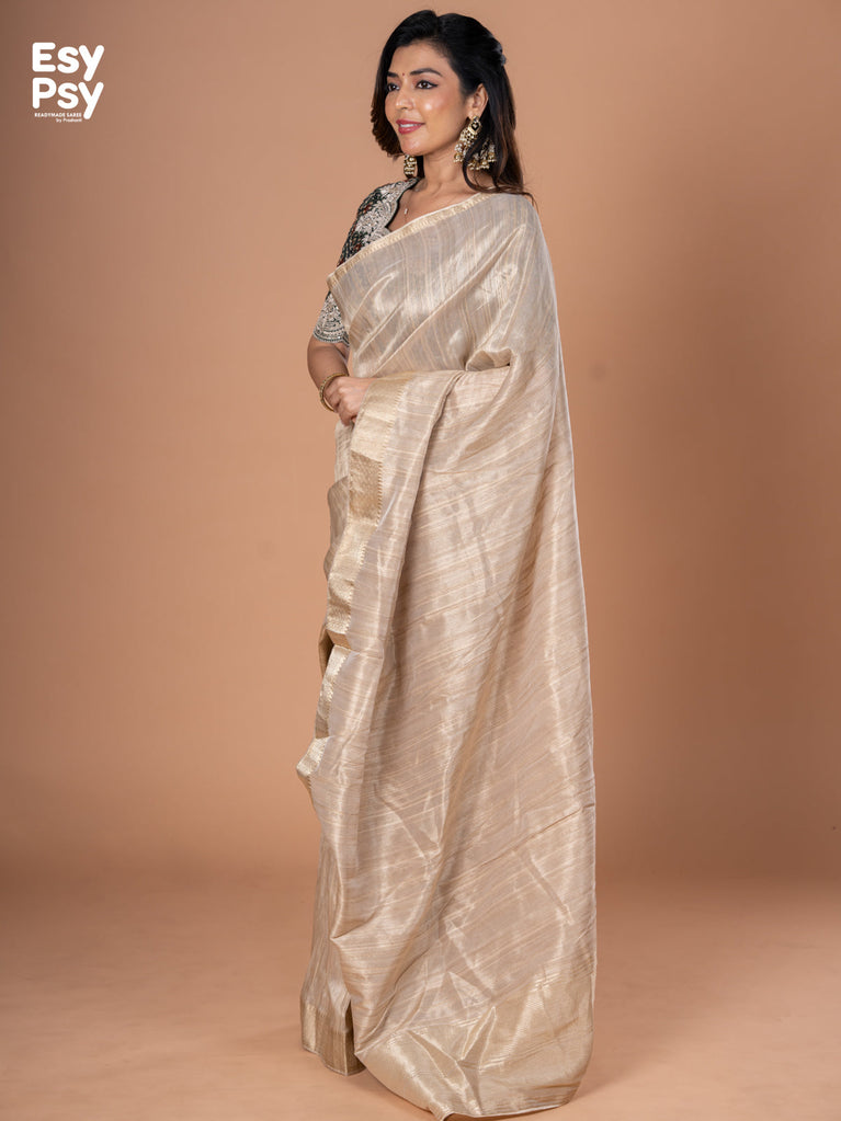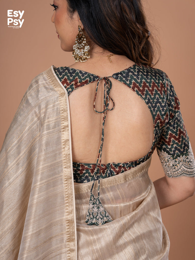 Beige Raw Silk readymade saree with readymade ajrakh printed blouse