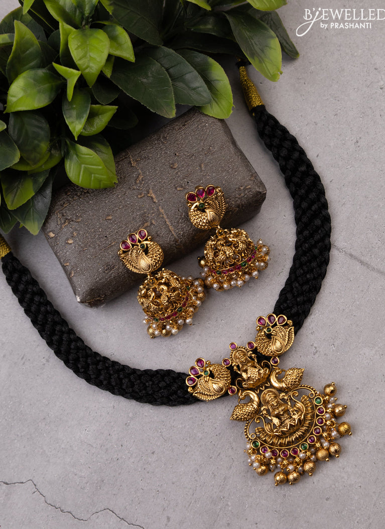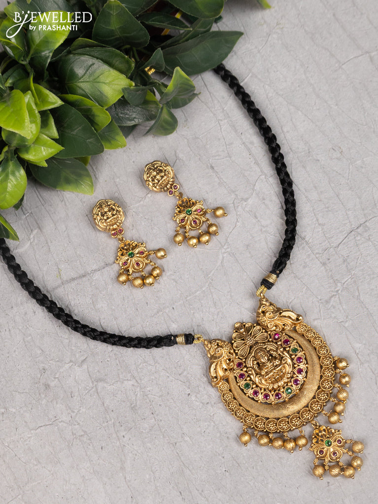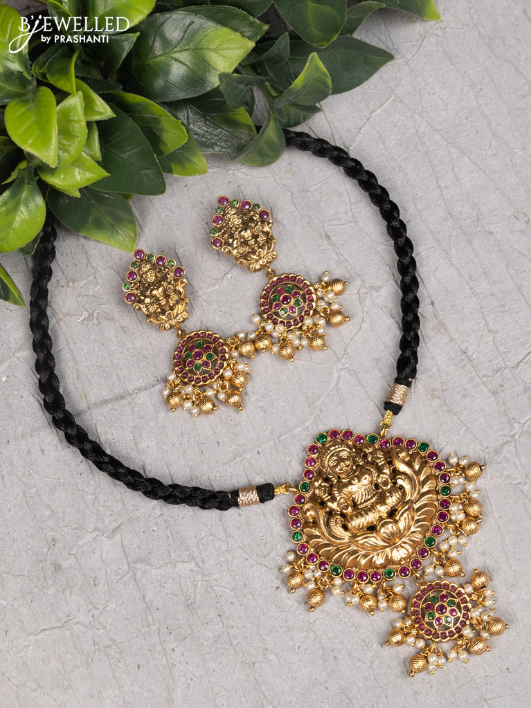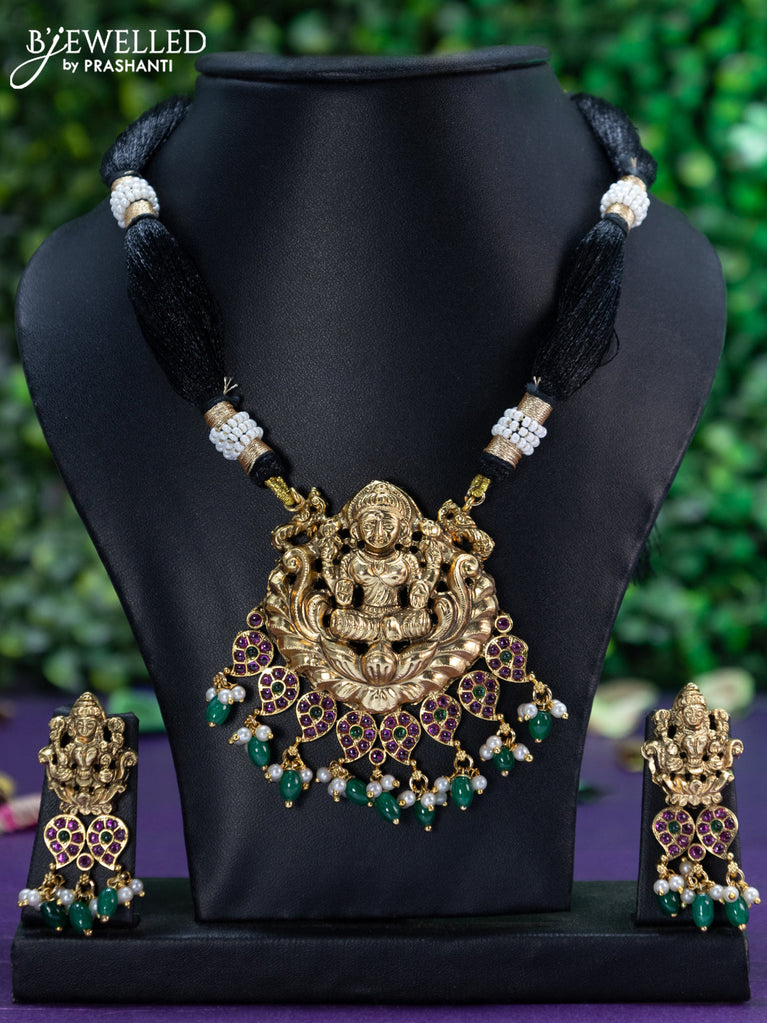 Black thread necklace lakshmi design with kemp & cz stones and golden beads hanging without earrings