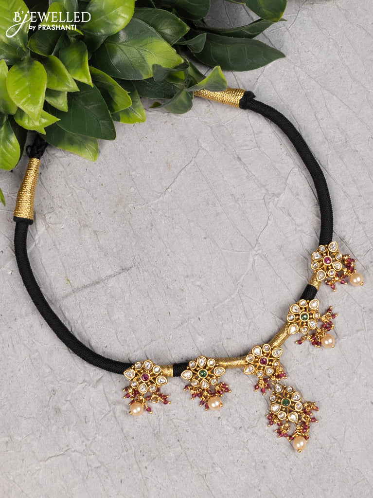 Black thread necklace manga pattern with kemp & kundan stones and pearl hangings