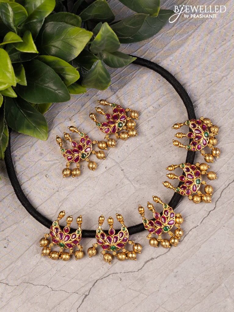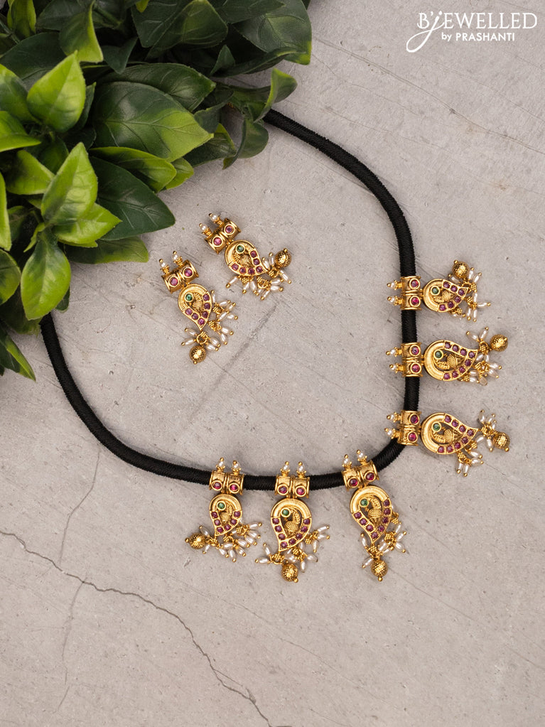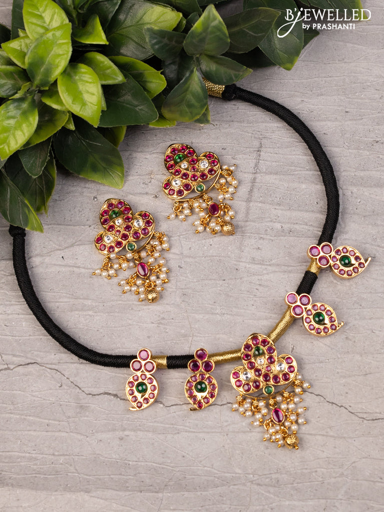 Black thread floral design necklace with kemp stone and pearl hangings without earrings