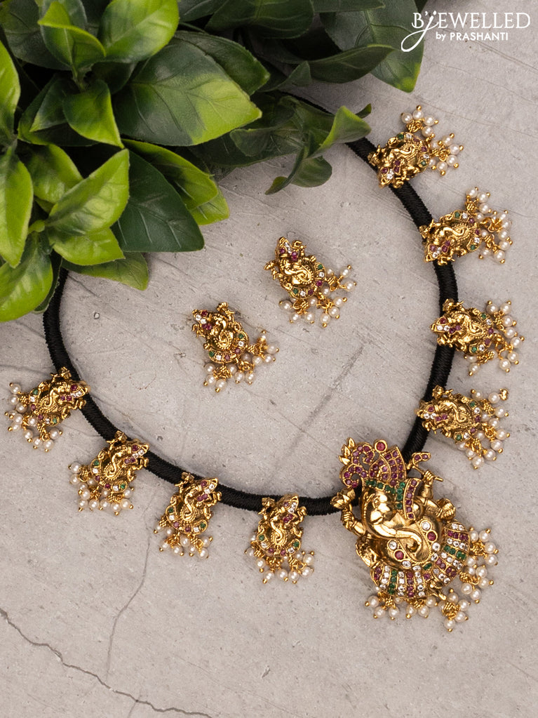 Black thread necklace ganesha design with kemp stones and pearl hangings