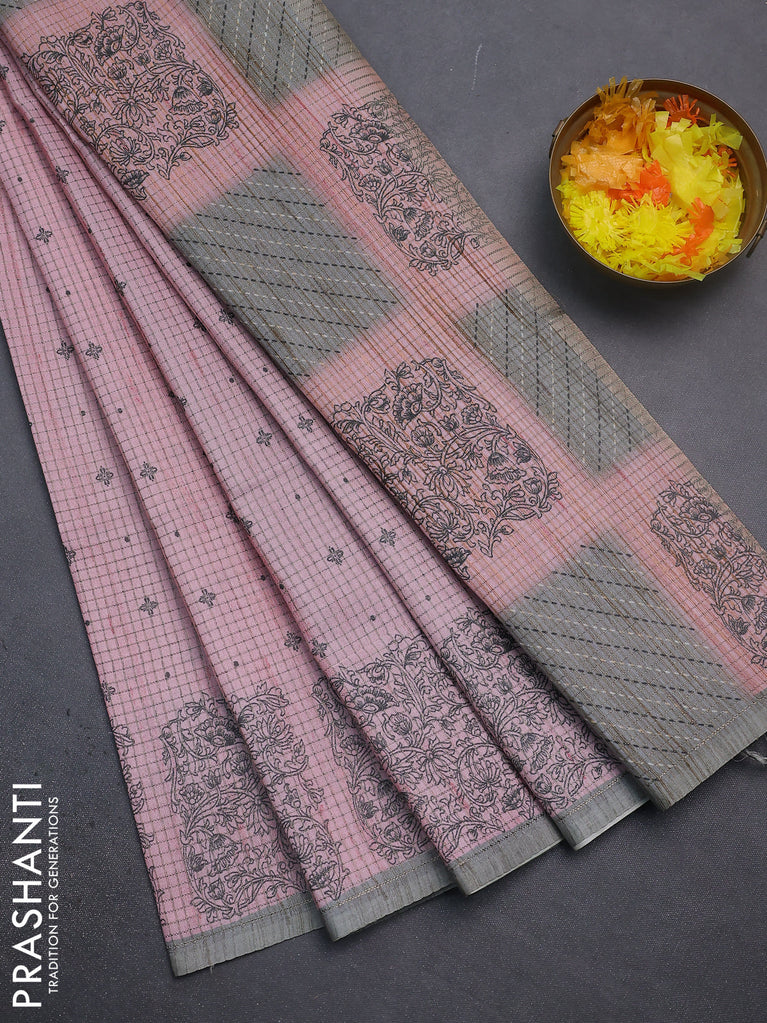 Chappa saree pink and grey with allover small zari checked pattern & prints and piping border