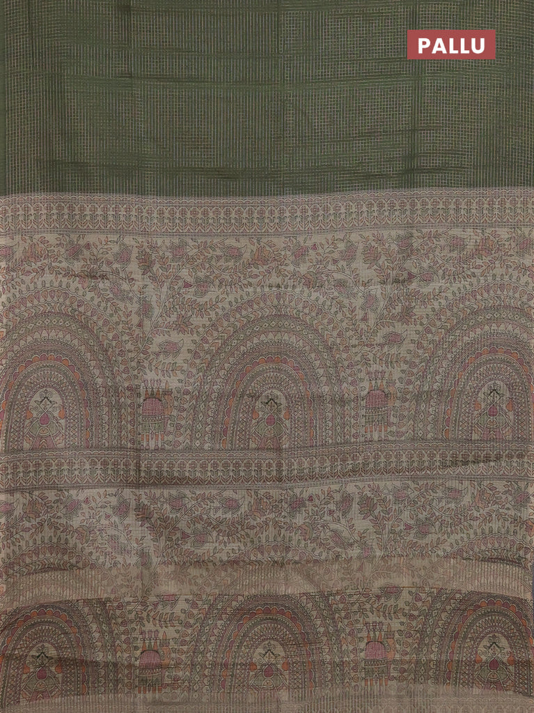 Chappa saree sap green and beige with allover small zari checked pattern and madhubani printed pallu