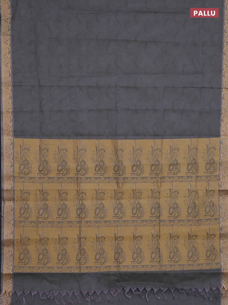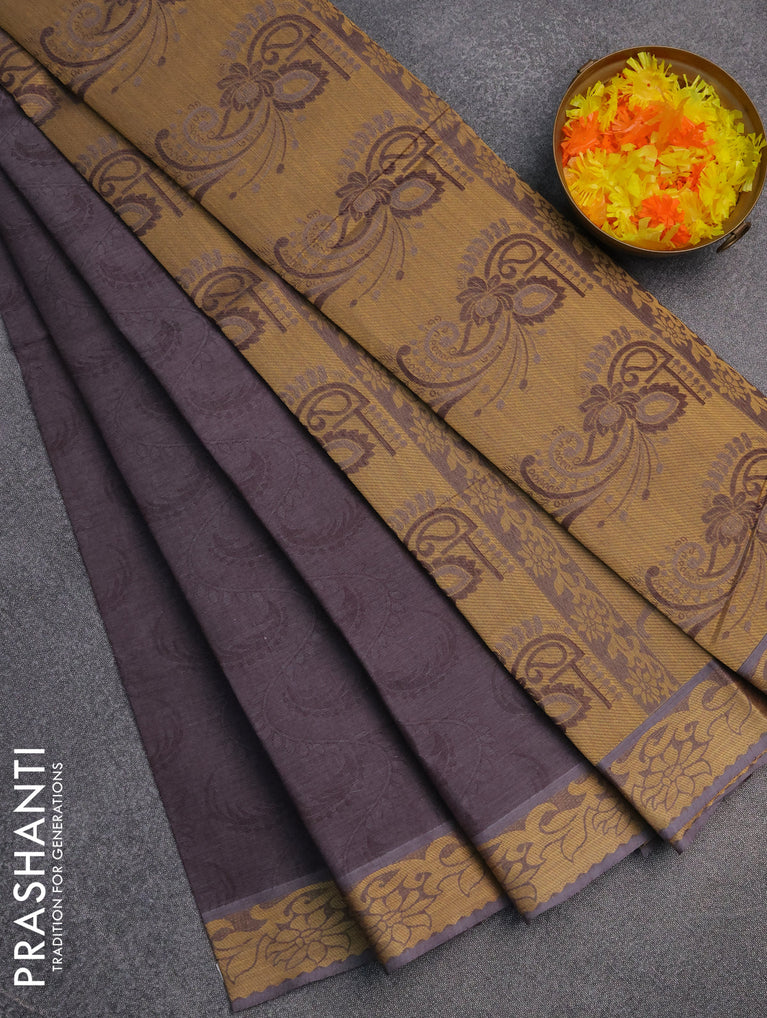Coimbatore cotton saree greyish blue and sandal with allover self emboss and thread woven border
