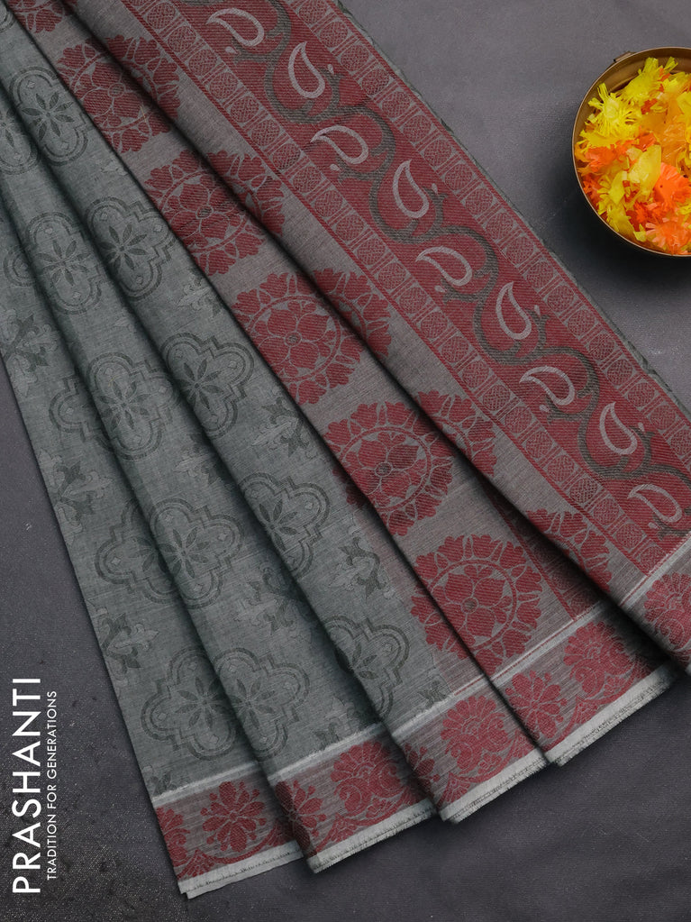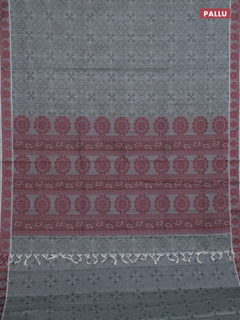 Coimbatore cotton saree greyish green and maroon with allover self emboss and thread woven border
