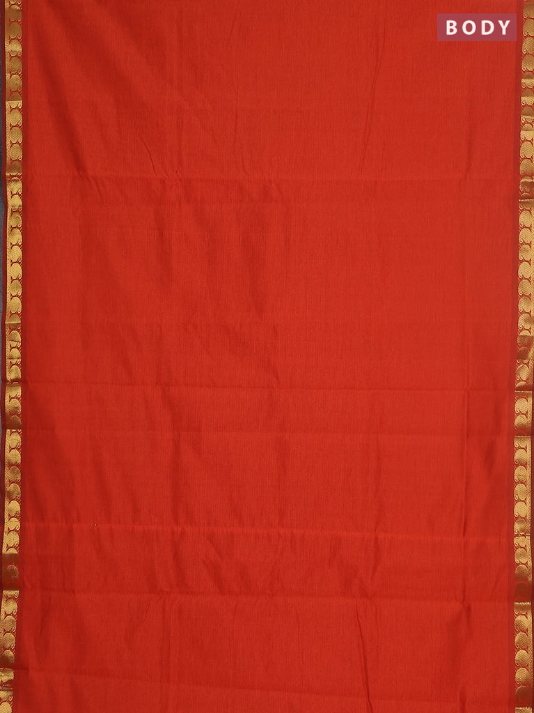 10 yards Poly cotton saree orange and green with plain body and rettapet zari woven border