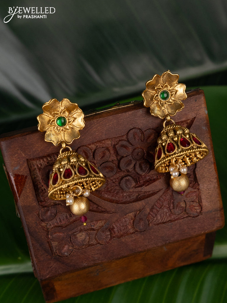 Antique jhumka with pink jadau kundan stones and pearl & beads hanging