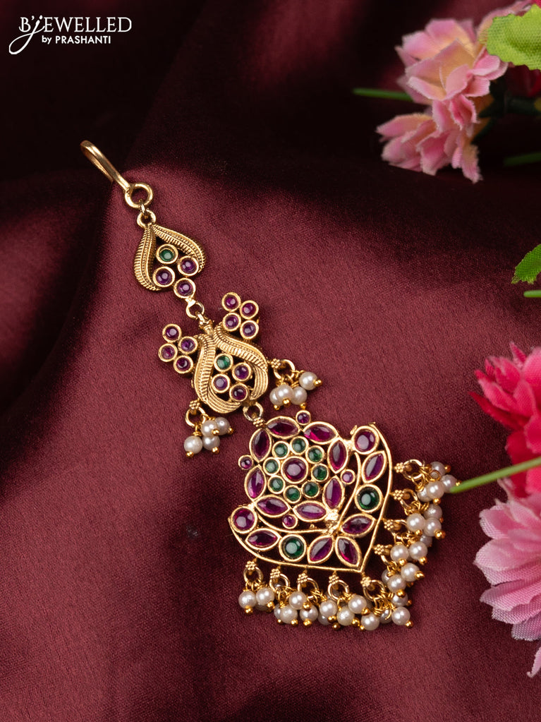 Antique maang tikka floral design with kemp & cz stones and pearl hangings