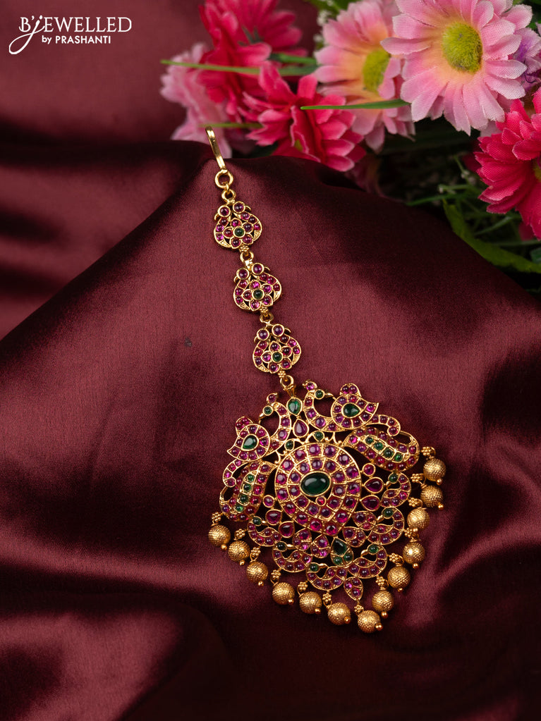 Antique maang tikka pecock design with kemp stones and golden beads hangings