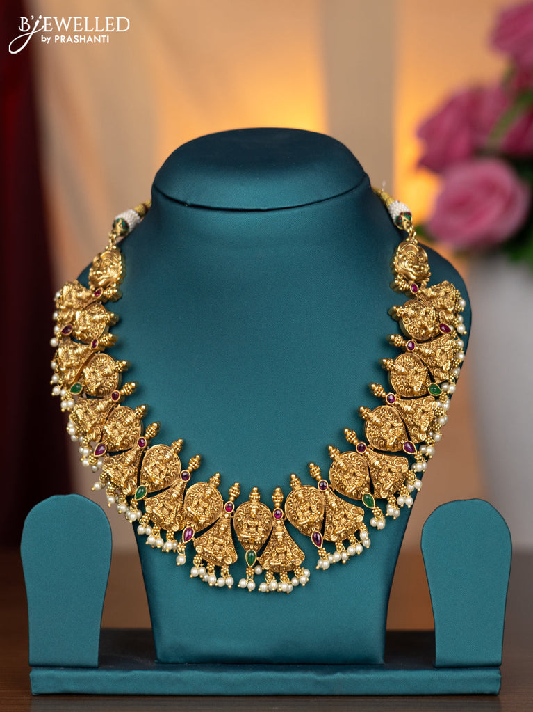 Antique necklace lakshmi design with pavalam green kemp & cz stones and pearl hangings