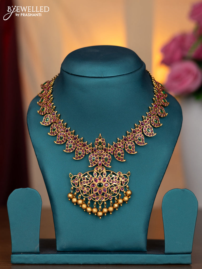 Antique necklace lakshmi design with pink kemp stones and green beads hanging
