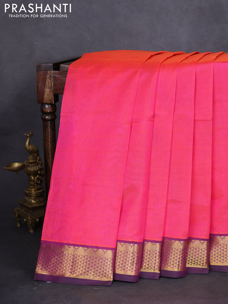 10 yards silk cotton saree dual shade of pinkish orange and blue with plain body and zari woven border