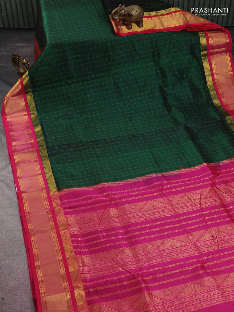 10 yards silk cotton saree green and pink with allover small zari checks and zari woven border