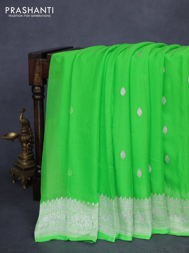 Banarasi chiffon silk saree light green with silver zari woven buttas and silver zari woven border