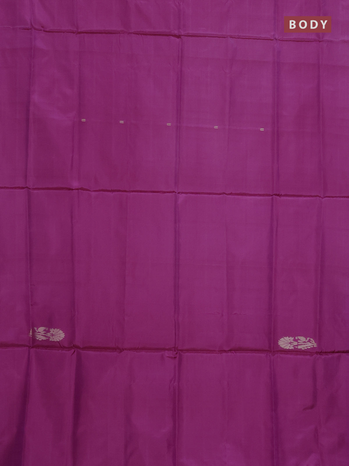 Banana pith saree purple and peach orange with thread woven buttas in borderless style