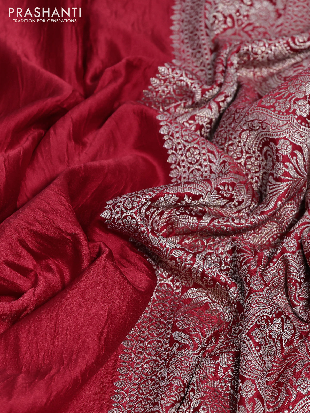 Banarasi crush crepe saree red with plain body and zari woven floral border