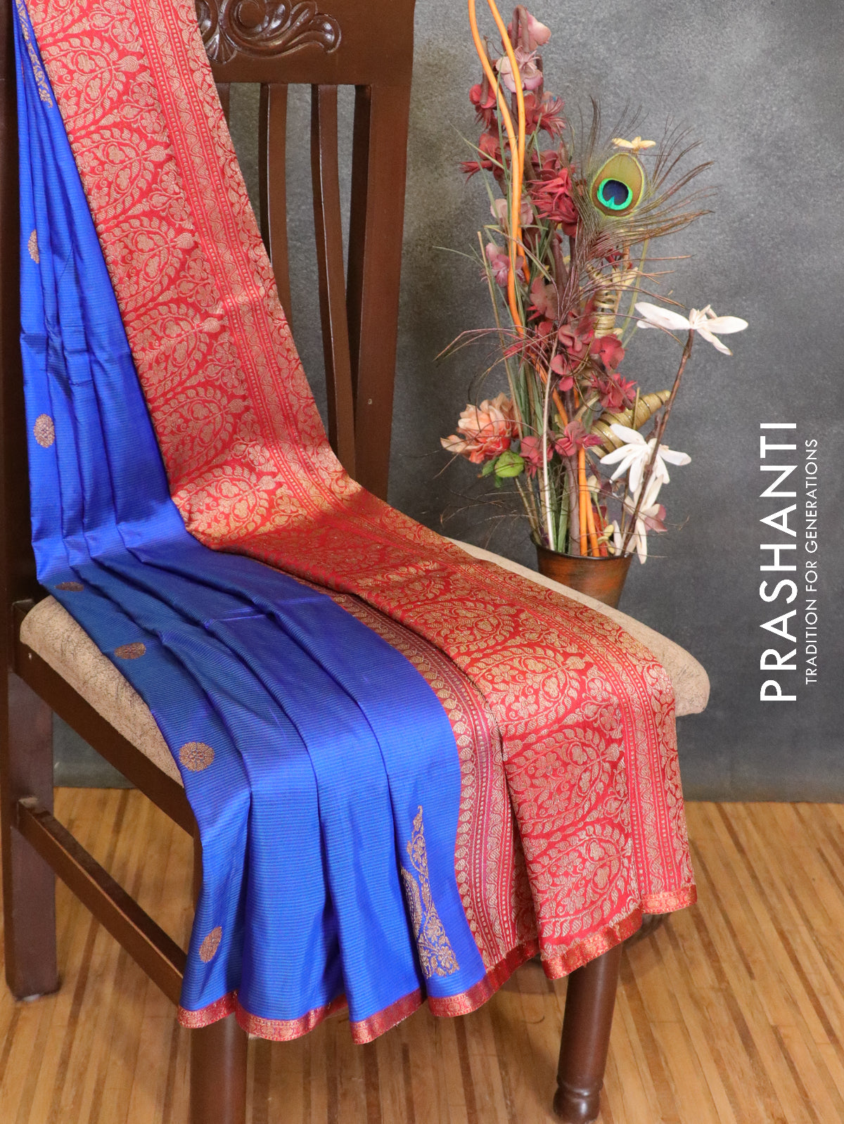 Banarasi katan silk saree blue and maroon with allover stripes woven buttas and small zari woven border