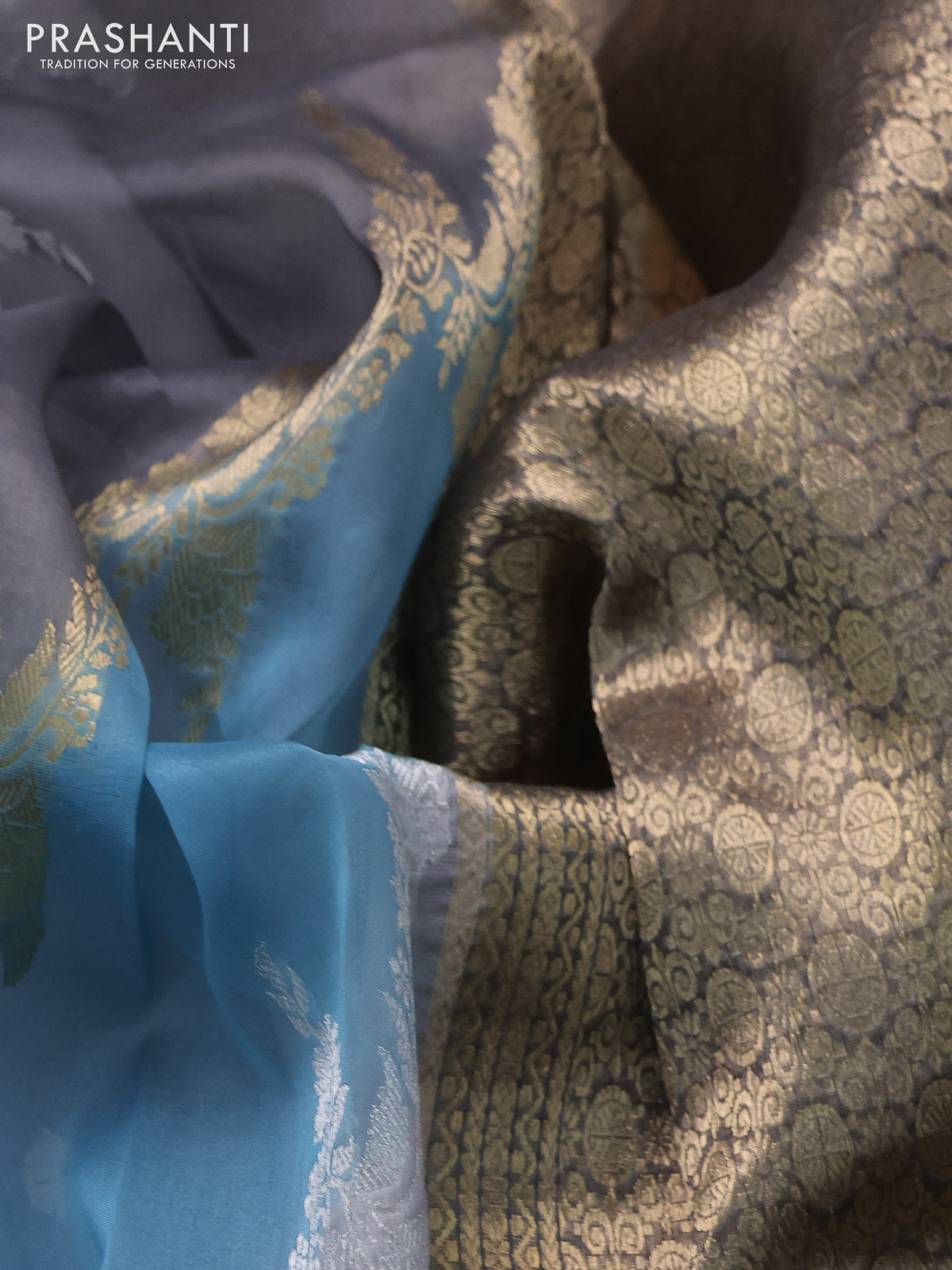 Banarasi organza silk saree grey and pastel blue with allover silver & gold zari weaves and zari woven piping boder