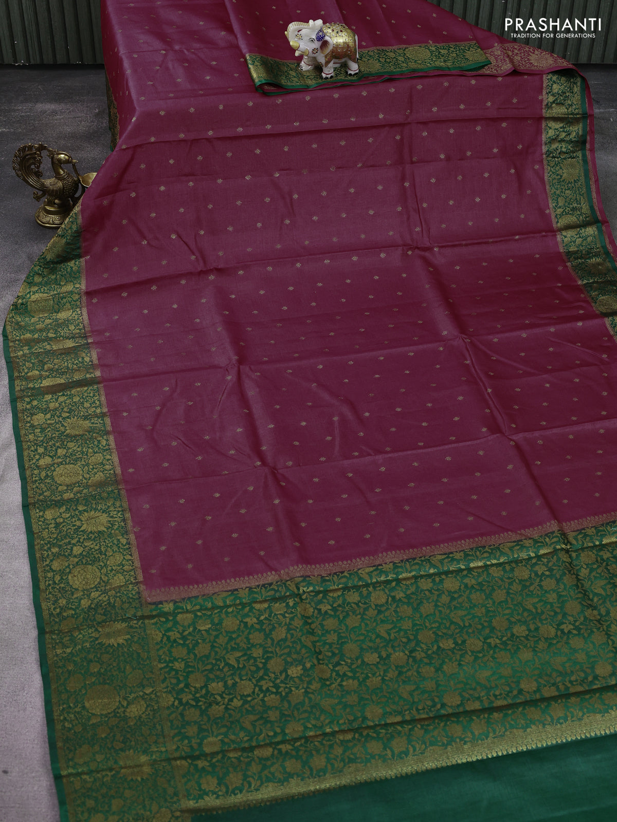 Banarasi tussar silk saree magenta pink and green with allover thread & zari woven buttas and woven border